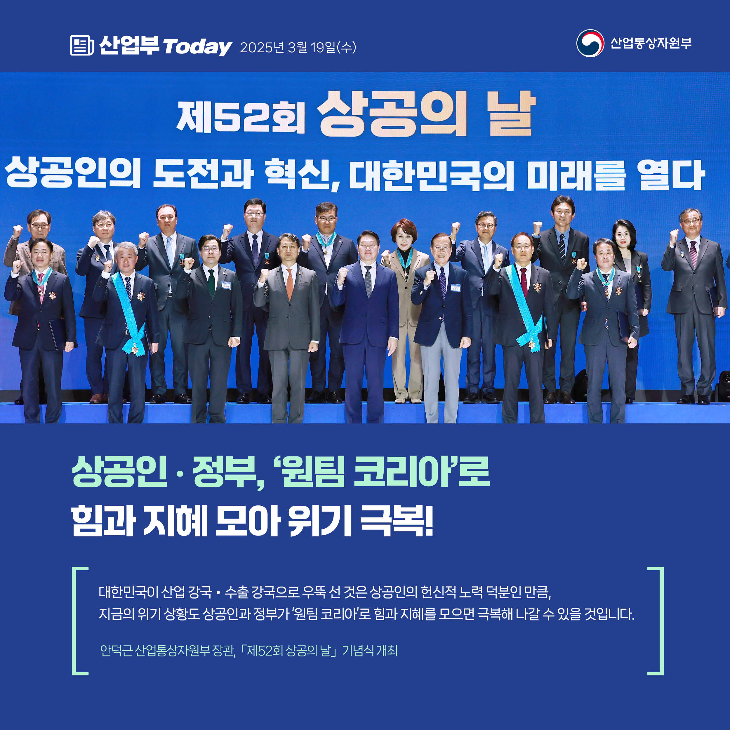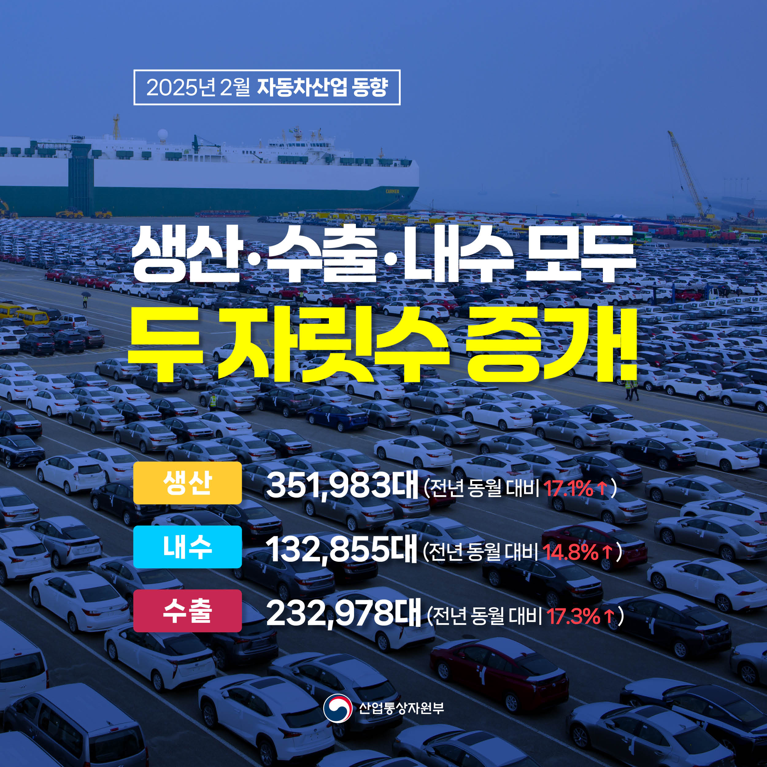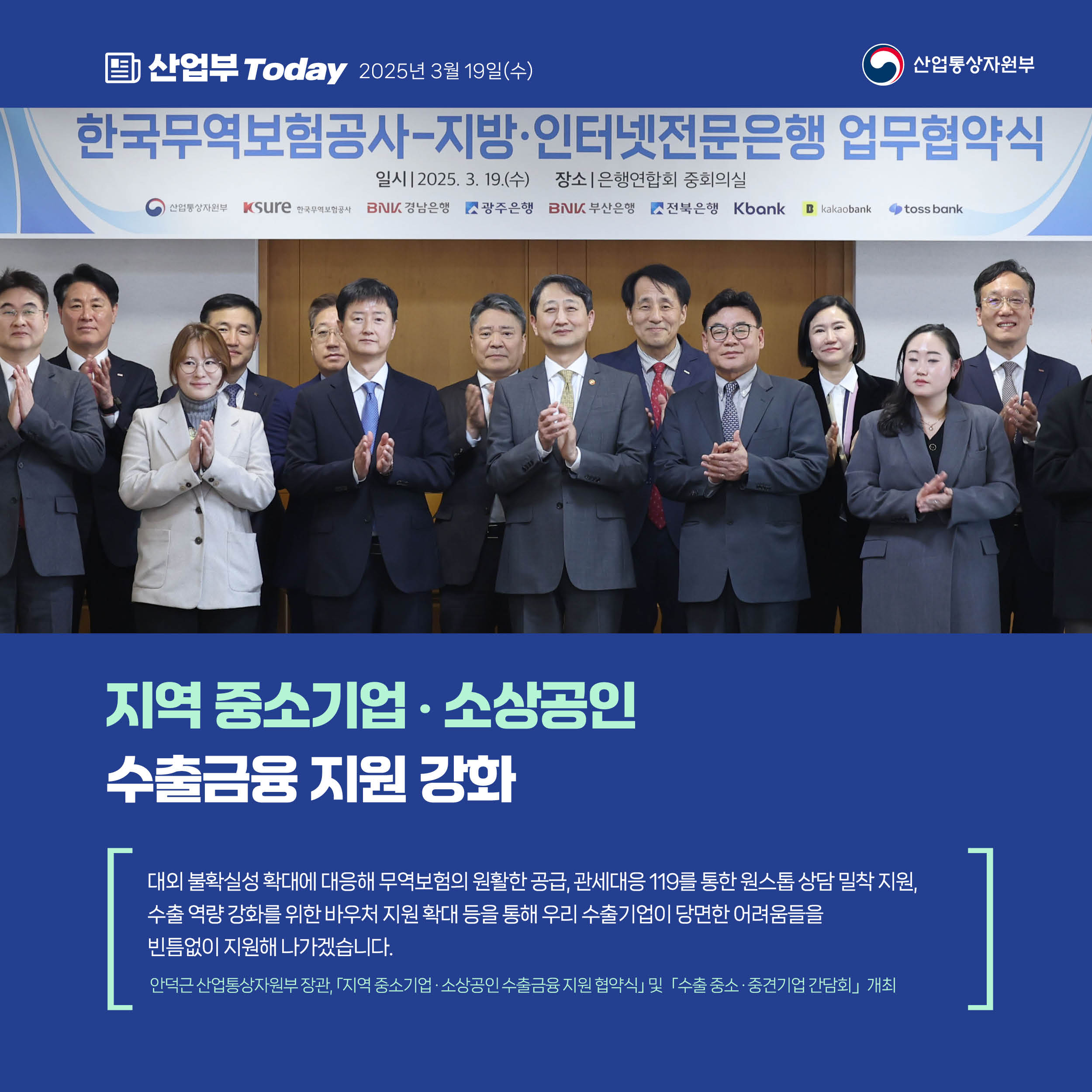 기간선택 날짜미지정 - 1주일 1개월 3개월 구분 제목 내용 담당자 담당부서 검색 전체557건 선택 10개 30개 50개 설정 한-미, 굳건한 동맹 기반 에너지 협력 강화 2025-03-21 조회수173 상세보기 지역 중소기업·소상공인 수출금융 지원 강화 2025-03-19 조회수216 상세보기 상공인‧정부, ‘원팀 코리아’로 힘과 지혜 모아 위기 극복! 2025-03-19 조회수136 상세보기 통상장벽‧불공정수입 총력 대응 2025-03-19 조회수221 상세보기 사실은 이렇습니다. 2025-03-18 조회수132 상세보기 2025년 2월 자동차산업 동향 2025-03-18 조회수210 상세보기 산업부-청년 원팀! 2030 청년자문단 2기 출범 2025-03-17 조회수137 상세보기 2025년 2월 ICT 수출입동향 2025-03-17 조회수155 상세보기 사실은 이렇습니다. 2025-03-17 조회수112 상세보기 처음으로이전페이지1112131415다음페이지마지막페이지 만족도 조사 이 페이지에서 제공하는 정보에 만족하셨습니까? 매우만족 만족 보통 불만족 매우불만족 등록하기 궁금한 사항이 있으세요? 담당부서홍보담당관 담당자이지선 주무관 연락처044-203-4574