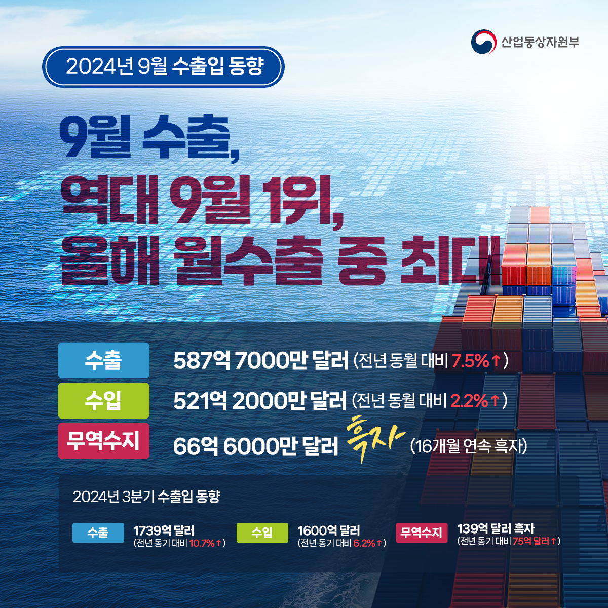 기간선택 날짜미지정 - 1주일 1개월 3개월 구분 제목 내용 담당자 담당부서 검색 전체557건 선택 10개 30개 50개 설정 한국-필리핀, 공급망‧원전 협력 강화! 2024-10-07 조회수291 상세보기 9월 수출, 역대 9월 1위, 올해 월 수출 중 최대 2024-10-02 조회수573 상세보기 3분기 누적 외국인투자 역대 최대! 2024-10-02 조회수500 상세보기 중견기업 분야 최대 일자리박람회, 최초로 지역에서 개최! 2024-10-02 조회수477 상세보기 역대 최대 수출 위해 범정부 역량 집중 2024-10-02 조회수414 상세보기 사실은 이렇습니다 2024-09-27 조회수693 상세보기 AI 자율제조 금융지원 협약식 2024-09-24 조회수592 상세보기 사실은 이렇습니다. 2024-09-24 조회수105 상세보기 사실은 이렇습니다 2024-09-23 조회수481 상세보기 처음으로이전페이지2627282930다음페이지마지막페이지 만족도 조사 이 페이지에서 제공하는 정보에 만족하셨습니까? 매우만족 만족 보통 불만족 매우불만족 등록하기 궁금한 사항이 있으세요? 담당부서홍보담당관 담당자이지선 주무관 연락처044-203-4574