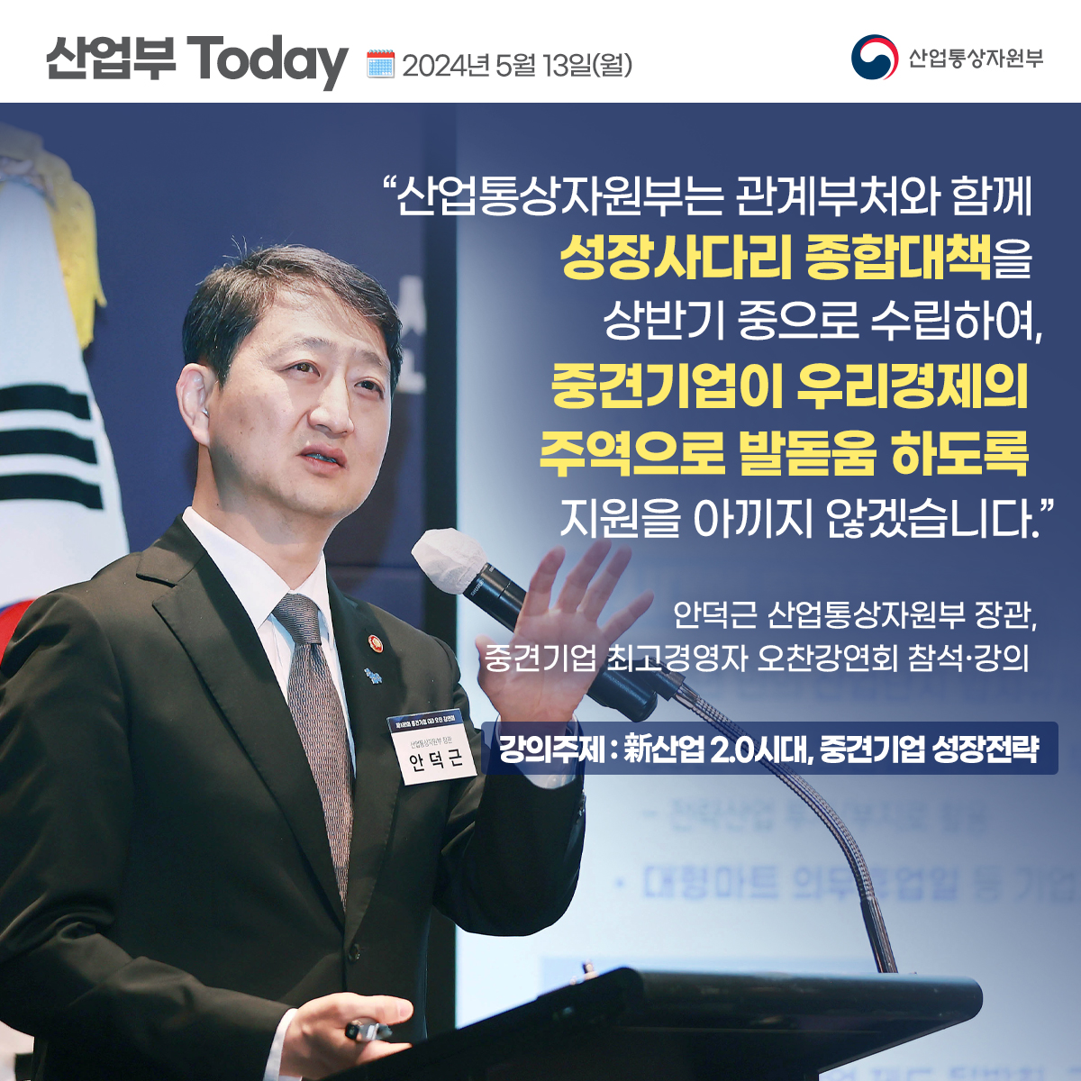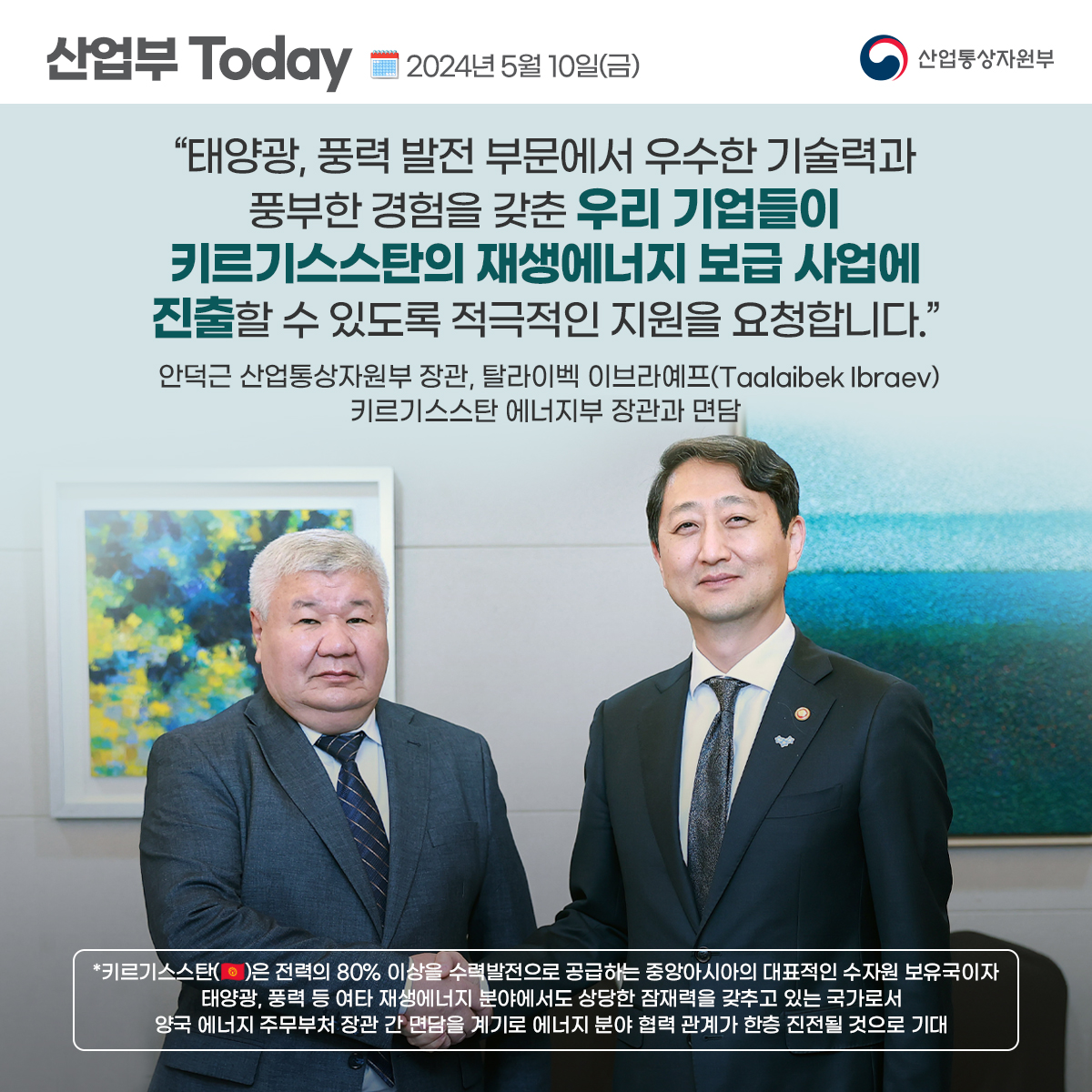 기간선택 날짜미지정 - 1주일 1개월 3개월 구분 제목 내용 담당자 담당부서 검색 전체557건 선택 10개 30개 50개 설정 첨단산업 분야 석ㆍ박사급 고급인재 2000명 양성 사업을 시작합니다. 2024-05-20 조회수197 상세보기 ICT 수출 6개월 연속 플러스 2024-05-16 조회수218 상세보기 사실은 이렇습니다. 2024-05-15 조회수115 상세보기 산업부 민생문답 - ③ 무역보험 제도 편 2024-05-14 조회수206 상세보기 산업부 민생문답 - ② 전기·생활용품 등 소비자 안전 편 2024-05-14 조회수259 상세보기 안덕근 산업통상자원부 장관, 동행축제 현장인 서울 망원시장 방문 2024-05-14 조회수167 상세보기 사실은 이렇습니다. 2024-05-14 조회수106 상세보기 안덕근 산업통상자원부 장관, 중견기업 최고경영자 오찬강연회 참석・강의 2024-05-13 조회수216 상세보기 안덕근 산업통상자원부 장관, 탈라이벡 이브라예프 키르기스스탄 에너지부 장관과 면담 2024-05-10 조회수175 상세보기 처음으로이전페이지4142434445다음페이지마지막페이지 만족도 조사 이 페이지에서 제공하는 정보에 만족하셨습니까? 매우만족 만족 보통 불만족 매우불만족 등록하기 궁금한 사항이 있으세요? 담당부서홍보담당관 담당자이지선 주무관 연락처044-203-4574