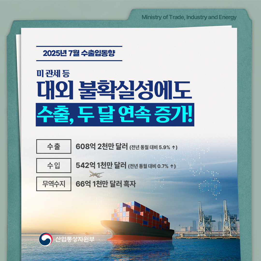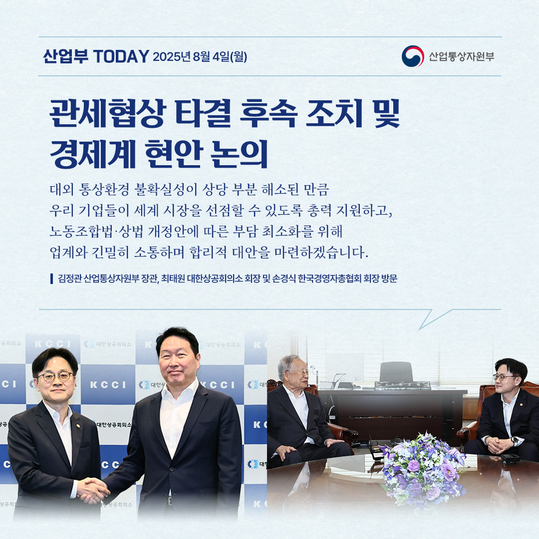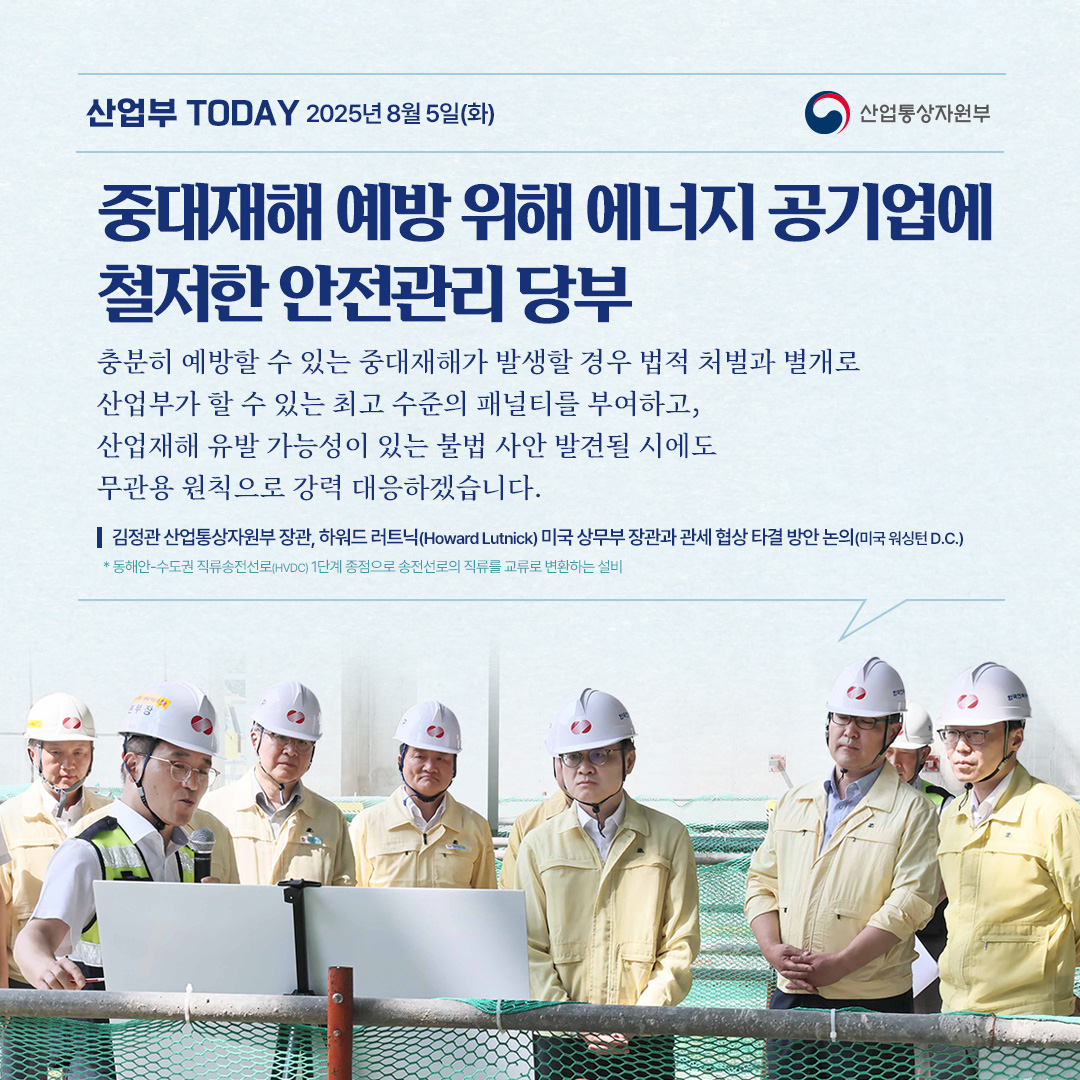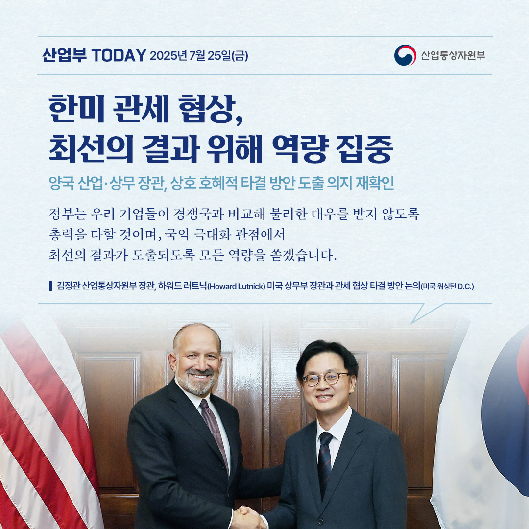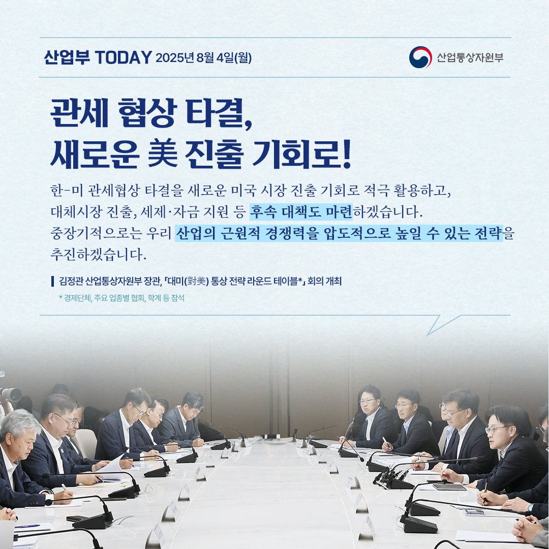기간선택 날짜미지정 - 1주일 1개월 3개월 구분 제목 내용 담당자 담당부서 검색 전체557건 선택 10개 30개 50개 설정 중대재해 예방 위해 에너지 공기업에 철저한 안전관리 당부 2025-08-05 조회수1,202 상세보기 관세협상 타결 후속 조치 및 경제계 현안 논의 2025-08-04 조회수977 상세보기 관세 협상 타결, 우리산업 경쟁력 강화 계기로! 2025-08-04 조회수932 상세보기 2025년 7월 수출입동향 2025-08-01 조회수1,365 상세보기 한미 관세 협상 타결! 대미 수출 불확실성 해소 2025-07-31 조회수1,137 상세보기 2025년 상반기 및 6월 주요 유통업체 매출 동향 2025-07-30 조회수1,468 상세보기 기회발전특구 추가 지정 전북‧경남에…울산은 지정면적 확대 2025-07-29 조회수944 상세보기 한미 관세 협상, 최선의 결과 위해 역량 집중 2025-07-25 조회수1,250 상세보기 정전의 신속한 복구와 추가 피해 예방에 최선을 다하겠습니다. 2025-07-23 조회수1,135 상세보기 처음으로이전페이지12345다음페이지마지막페이지 만족도 조사 이 페이지에서 제공하는 정보에 만족하셨습니까? 매우만족 만족 보통 불만족 매우불만족 등록하기 궁금한 사항이 있으세요? 담당부서홍보담당관 담당자이지선 주무관 연락처044-203-4574