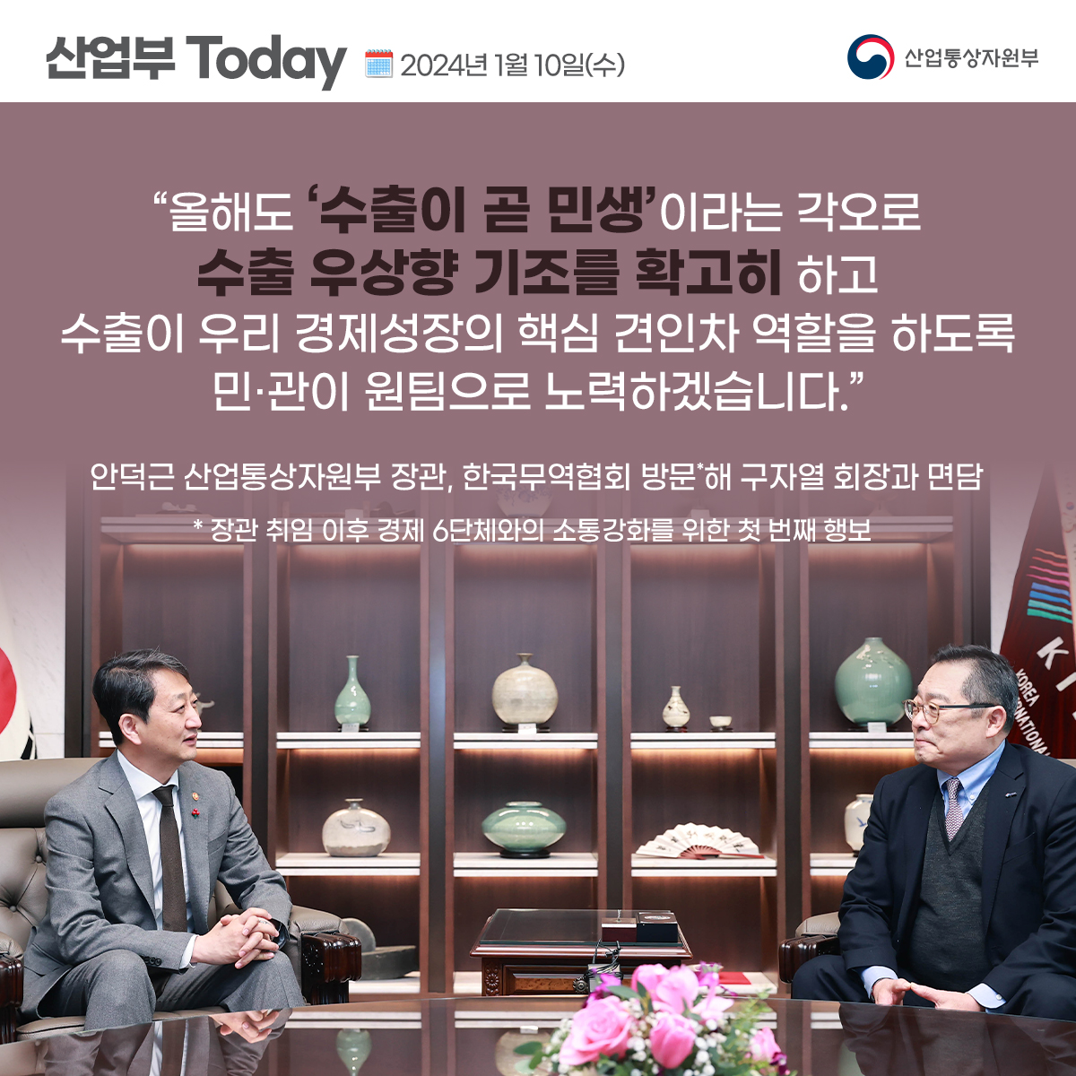 기간선택 날짜미지정 - 1주일 1개월 3개월 구분 제목 내용 담당자 담당부서 검색 전체557건 선택 10개 30개 50개 설정 세계 최대·최고 반도체 메가 클러스터 조성! 2024-01-15 조회수321 상세보기 안덕근 산업통상자원부 장관, ‘2024년 원자력계 신년인사회’ 참석 2024-01-11 조회수256 상세보기 안덕근 산업통상자원부 장관, 한국무역협회 방문해 구자열 회장과 면담 2024-01-10 조회수157 상세보기 한-중미 FTA ‘완전체’ 됐다 2024-01-09 조회수209 상세보기 2023년 플랜트 수주 실적 8년 만에 최대 2024-01-08 조회수195 상세보기 안덕근 산업통상자원부 장관, 경기도 고양시 경로당 방문(난방비 대책 이행 현황 점검) 2024-01-08 조회수152 상세보기 신고‧도착 기준 모두 역대 최대 실적 달성! 2024-01-04 조회수169 상세보기 사실은 이렇습니다. 2024-01-04 조회수123 상세보기 수출, 1분기 저점 이후 개선…10월 플러스 전환 2024-01-02 조회수178 상세보기 처음으로이전페이지5152535455다음페이지마지막페이지 만족도 조사 이 페이지에서 제공하는 정보에 만족하셨습니까? 매우만족 만족 보통 불만족 매우불만족 등록하기 궁금한 사항이 있으세요? 담당부서홍보담당관 담당자이지선 주무관 연락처044-203-4574